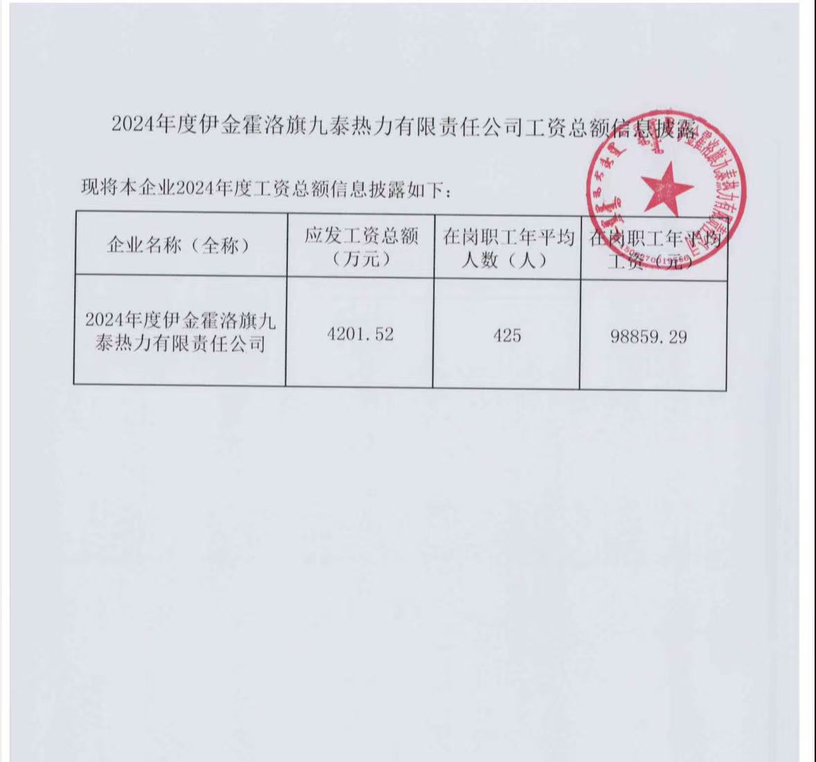 2024年度伊金霍洛旗九泰热力有限责任公司工资总额信息披露